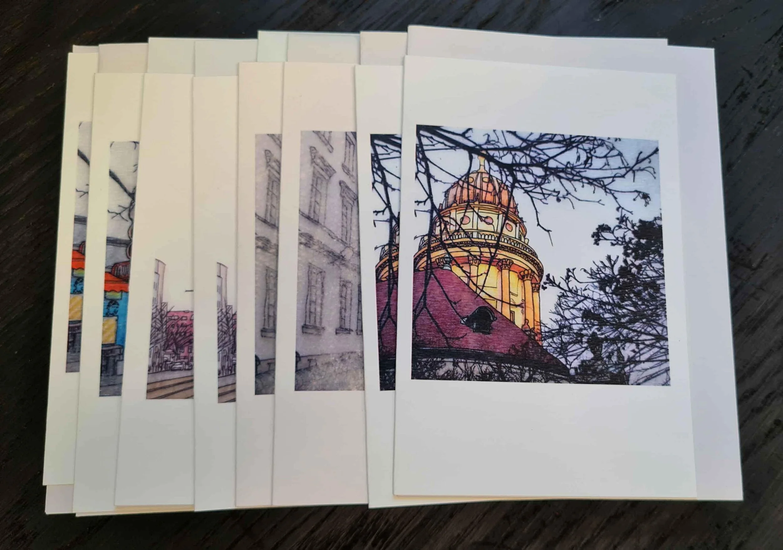 These high quality A6 (105x148mm) greeting cards are printed on beautifully textured card stock. All images are taken from original Chloë Waddell artworks of in and around Munich and Berlin